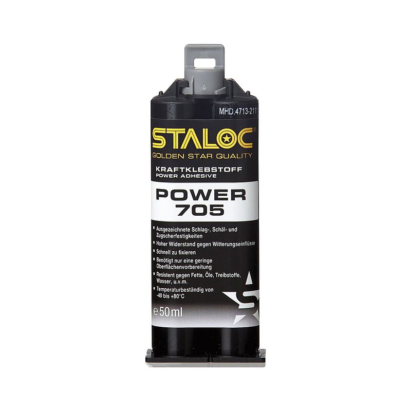 STALOC POWER 705 Kraftklebstoff verfügt über eine ausgezeichnete Schlag-, Schäl- und Zugscherfestigkeit. Dieser Kraftklebstoff bietet eine hohe Flexibilität und einen hohen Widerstand gegen Witterungseinflüsse. Dabei ist er schnell zu fixieren. Ein Klebespalt von 0,25 bis 0,5 mm muss zur Verfügung stehen, um eine optimale Verklebung zu erreichen.