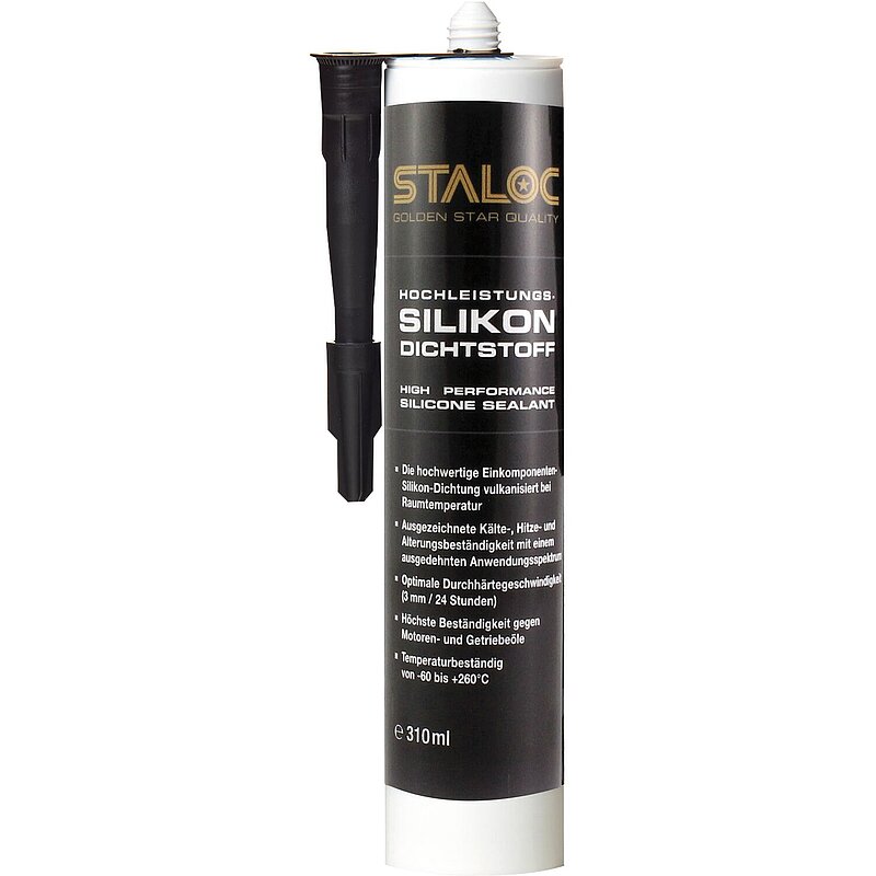 STALOC Hochleistungssilikondichtstoff öl-/temperaturbeständig ist ein neutrales und einkomponentiges Hochleistungsdichtmittel welches bei Raumtemperatur zu einem Silikon-Kautschuk ausvulkanisiert. STALOC Hochleistungssilikondichtstoff öl-/temperaturbeständig bleibt elastisch mit hoher Adhäsion und kann somit dynamischen Belastungen wie z.B. Stößen und Vibrationen standhalten. STALOC Hochleistungssilikondichtstoff öl-/temperaturbeständig ersetzt herkömmliche Feststoffdichtungen und kann universell eingesetzt werden. Das Dichtmittel besitzt eine sehr gute Temperaturbeständigkeit.