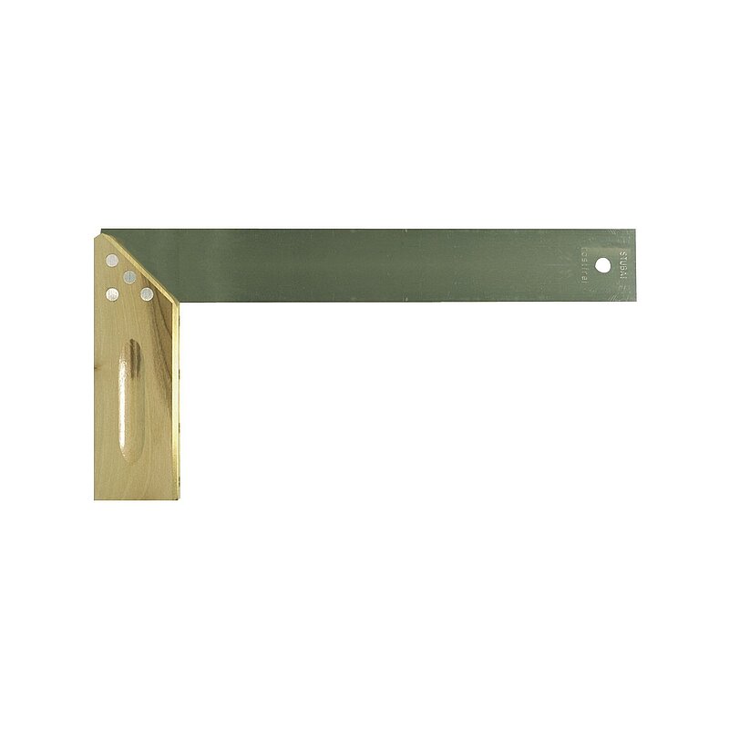 Mit Gehrungsanschlag, blanker und rostfreier Stahlschiene, ohne Maßeinteilung, mit Nussholzschenkel und Messingbeschlag.