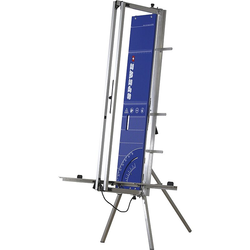 Mehrfach verleimte Multiplex-Sperrholzplatte mit Skalierung. Schwenkfüsse für schnellen und einfachen Aufbau. Schwenkbarer Schneidbügel für Gehrungsschnitte bis 45°. Eloxierte Führungsschiene für das Eckschneider-Zusatzgerät. Mit zusätzlicher Auflageschiene und seitlichen Plattenführungen. Tiefenanschlag für Falz-, Nut-, Auftrenn- oder Sparrenausschnitte. Schwenkbare Plattenstütze als Kippsicherung bei dicken Platten. Geländerbefestigung / - halterung (Gurt) als Kippsicherung bei Anlehnung an Gerüstgeländer.