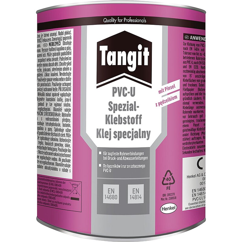 Spezialkleber zum Verkleben von thermoplastischen Druckrohrleitungssystemen aus PVC-U nach EN 1452 (nur für Abwasserleitungen) und EN ISO 15493, sowie für drucklose Rohrleitungssysteme nach EN1329.
