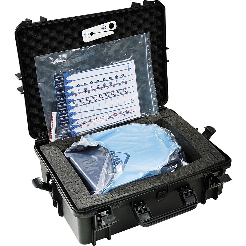 Bei der jährlichen Prüfung wird die Plombe entfernt und der Koffer geöffnet. Der Vakuumbeutel wird auf Beschädigungen und ob er „Luft gezogen“ hat, kontrolliert. Wenn keine Mängel ersichtlich sind, wird diese Überprüfung auf der Prüfkarte vermerkt und eine neue Plombe entnommen. Dann wird der Koffer wieder verschlossen und verplombt. Dieser Prozess kann bis max. 10 Jahre durchgeführt werden.