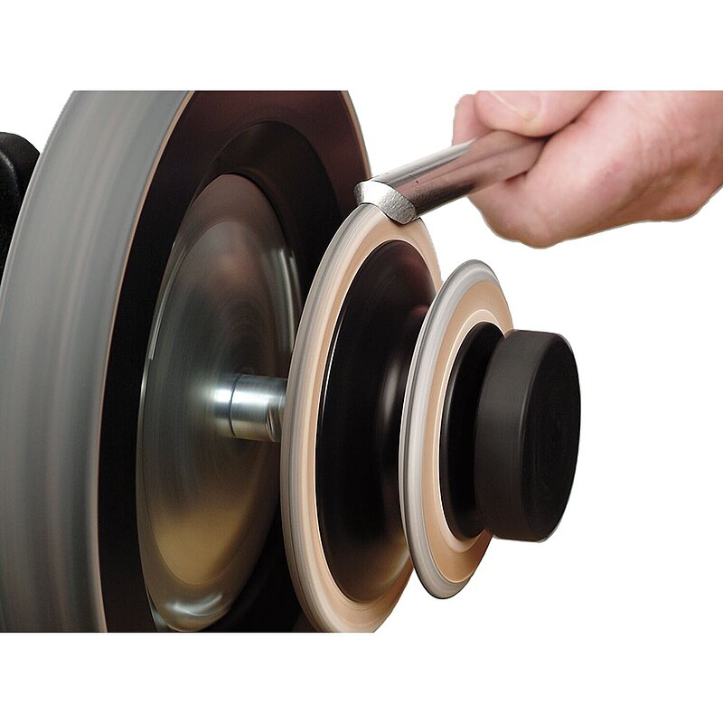 Profilierte Lederabziehscheibe: Mit auswechselbaren Lederscheiben zum Abziehen und Polieren der Innenseite von Drehröhren und Geißfüßen.