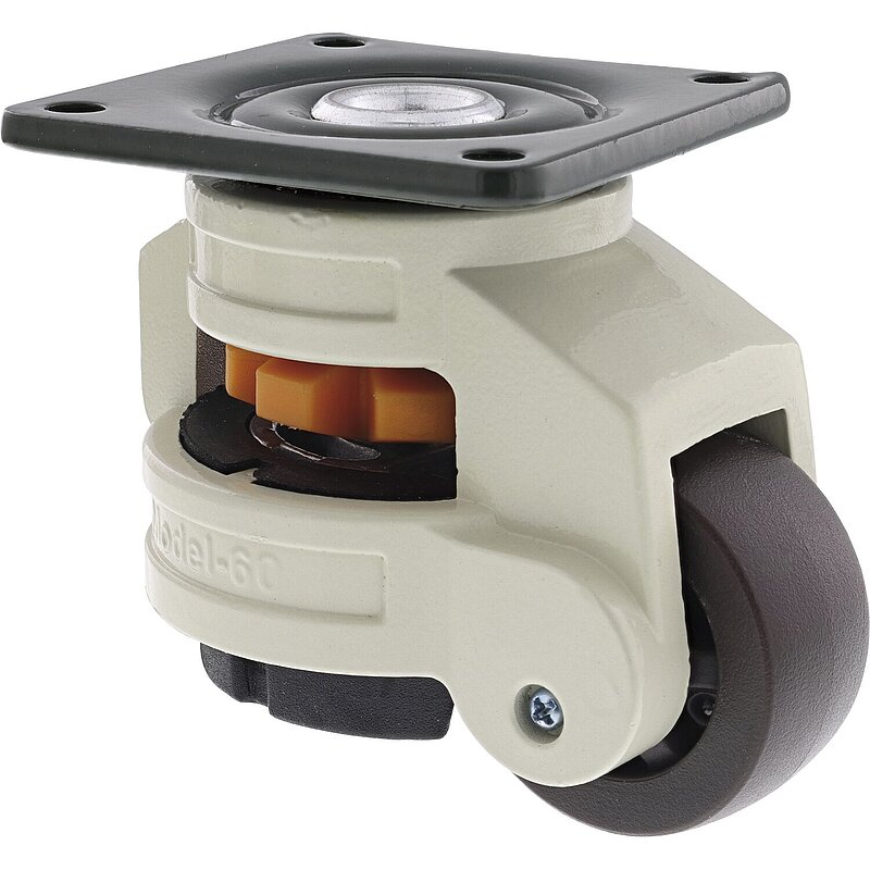 Diese Spezialrolle kombiniert zwei Funktionen in einem: Sie dient als Schwerlast-Lenkrolle und die leicht bedienbare Nivellierfunktion verwandelt mit wenigen Drehbewegungen mobile Geräte durch den integrierten Standfuß schnell in standfeste Arbeitsstationen. Das Gehäuse besteht aus robustem Aluminium-Druckguss, die Anschraubplatte aus massivem Industriestahl. Die Radlauffläche aus abriebfestem Kunststoff (PA) sorgt für hohe Belastbarkeit, während der rutschhemmende Standfuß aus weichem TPR sicheren Halt bietet. Die kompakte Bauweise und die hochwertige Verarbeitung garantieren Langlebigkeit, besten Fahrkomfort und zuverlässige Stabilität – selbst bei Dauerbelastung.