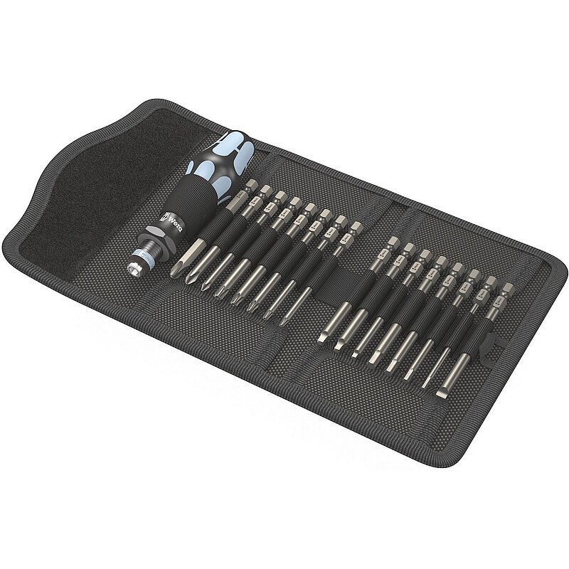 Falttasche mit 89 mm langen Bits. Inklusive Handhalter 3816 R Kraftform mit Schnellwechselfutter "Rapidaptor" und mehrkomponentigem Kraftform-Griff für ermüdungsarmes Arbeiten. Edelstahlausführung zur Vermeidung von Fremdrost. 17-teilig.