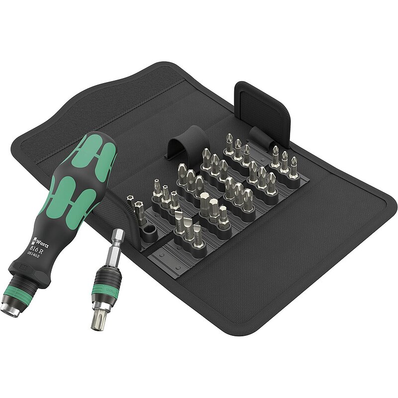 32-teiliges Set mit Handhalter 816 R Kraftform mit Schnellwechselfutter "Rapidaptor" und mehrkomponentigem Kraftform-Griff für ermüdungsarmes Arbeiten. Universalhalter Rapidaptor mit starkem Dauermagnet, der auch große und schwere Schrauben hält. Gemeinsam mit den 30 Bits ist der Anwender für fast jeden Anwendungsfall gerüstet. In robuster textiler Box; geeignet für Wera 2go.
