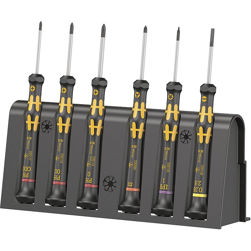 Elektrostatisch abgesicherter Wera Micro Schraubendrehersatz. Sicherer Schutz vor elektrostatischer Energie und damit verbundenen Schäden. Durch Abstützen der Hand auf der Drehkappe und durch die Schnelldrehzone unterhalb der Drehkappe ist blitzschnelles Zwirbeln möglich. Zeitintensives Umgreifen entfällt. Kraftzone mit integrierten Weichzonen sorgt für die Übertragung hoher Löse- und Anzugsmomente. Präzisionszone für den richtigen Drehwinkel bei Justierarbeiten. Die Wera Black Point-Spitze bietet Passgenauigkeit und optimierten Korrosionsschutz.