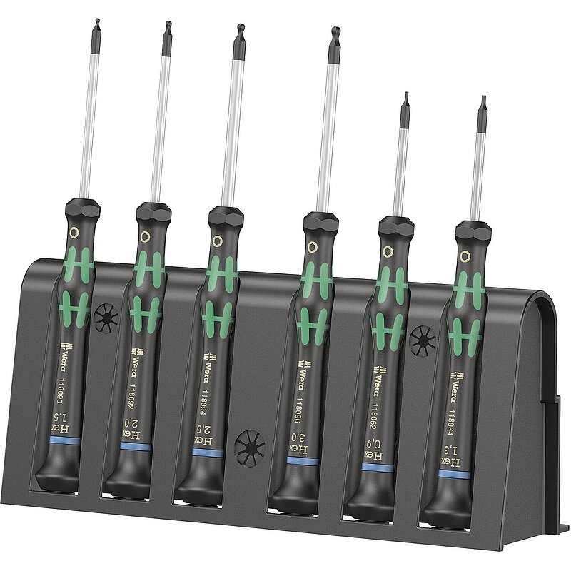 Hochwertiger Wera Micro Schraubendrehersatz für feinmechanische Verschraubungen. Durch die kugelförmigen Abtriebsprofile ist ein Auslenken oder Schwenken der Werkzeugachse zur Schraubenachse möglich, so dass dadurch "um die Ecke" geschraubt werden kann. Durch Abstützen der Hand auf der Drehkappe und die Schnelldrehzone unterhalb der Drehkappe ist blitzschnelles Zwirbeln möglich. Kraftzone mit integrierten Weichzonen sorgt für die Übertragung hoher Löse- und Anzugsmomente. Präzisionszone für den richtigen Drehwinkel bei Justierarbeiten. Wera Black Point-Spitze bietet Passgenauigkeit und optimierten Korrosionsschutz. Inklusive praktischem Rack zur übersichtlichen Aufbewahrung der Schraubendreher.