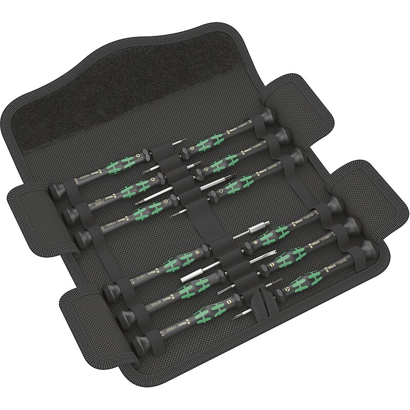 Hochwertiger Wera Micro Schraubendrehersatz für feinmechanische Verschraubungen. Durch Abstützen der Hand auf der Drehkappe und durch die Schnelldrehzone unterhalb der Drehkappe ist blitzschnelles Zwirbeln möglich. Zeitintensives Umgreifen entfällt. Kraftzone mit integrierten Weichzonen sorgt für die Übertragung hoher Löse- und Anzugsmomente. Präzisionszone für den richtigen Drehwinkel bei Justierarbeiten. Die Wera Black Point-Spitze bietet Passgenauigkeit und optimierten Korrosionsschutz. Inklusive praktischem Rack zur übersichtlichen Aufbewahrung der Schraubendreher.