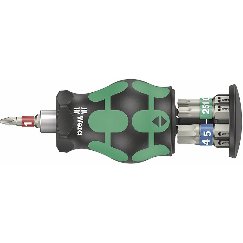 Stubby-Magazin für schnelle Anwendungen am Fahrrad. Besonders kleiner Bits-Handhalter mit kurzer Bitaufnahme für schwer zugängliche Bereiche. Inklusive 7 Edelstahl-Bits, davon 6 in einem Magazin im Handgriff und 1 im Bithalter. Der 2-komponentige Kraftform Griff mit seiner praktischen Kombination aus Hart- und Weichzonen ermöglicht festes Zupacken und präzises Arbeiten. Take it easy Werkzeugfinder: Mit Abtrieb-Farbkennzeichung und Größenstempel für einfaches Finden des gewünschten Bits.