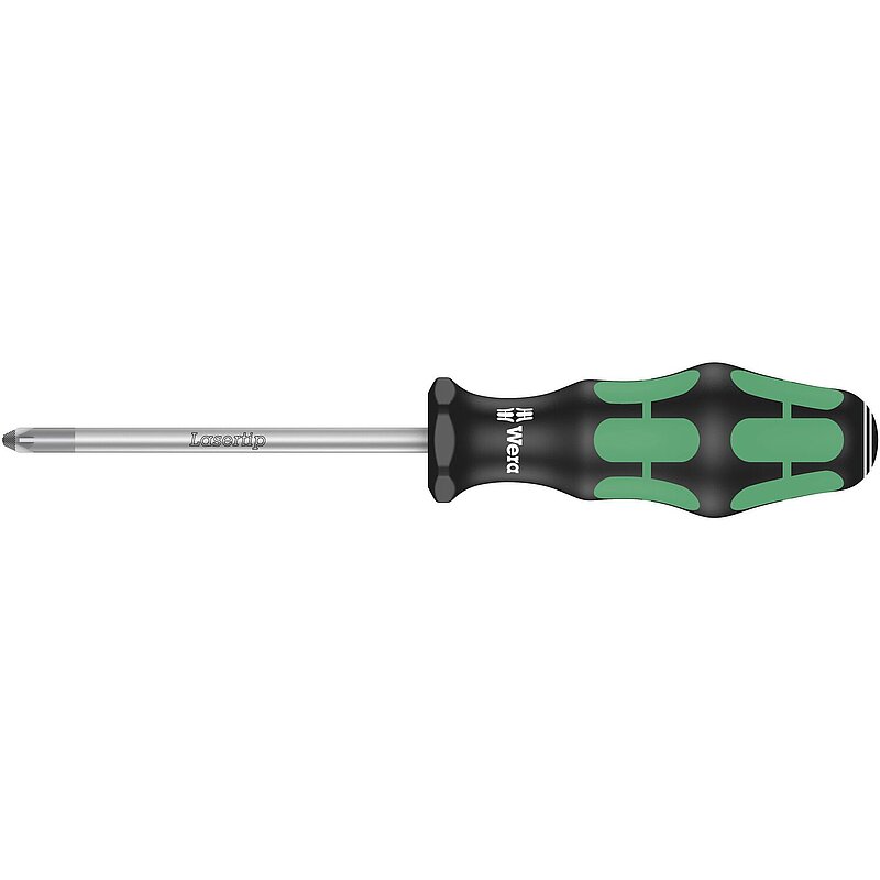 Rundklinge, Kraftform-Griff (mit Hart- und Weichzonen) mit Abrollschutz und Größenkennzeichnung. Die Laserbehandlung der Klingenspitze (Lasertip) schafft eine microraue Oberfläche, die sich im Schraubenkopf förmlich festbeißt.
