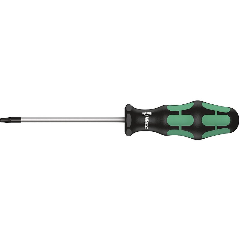 TORX PLUS® Profil: Im Vergleich zum "normalen" TORX® Profil wird die Vergrößerung der 6 drehmomentübertragenden Flanken zwischen Werkzeug und Schraube durch einen ellipsen- und nicht kreisförmigen Profilaufbau realisiert. Dadurch wird die angewendete Kraft beim Verschrauben auf größere Flächen verteilt. Höhere Drehmomente werden übertragen und die Lebensdauer von Schraube und Werkzeug wird zusätzlich erhöht. Mehrkomponentiger Kraftform Griff für schnelles und schonendes Arbeiten. Kraftform Plus: Harte Griffzonen für hohe Arbeitsgeschwindigkeit, während weiche Griffzonen hohe Drehmomentübertragung garantieren. Die Wera Black Point-Spitze bietet Passgenauigkeit und optimierten Korrosionsschutz. Der Sechskantabrollschutz verhindert lästiges Wegrollen am Arbeitsplatz. Mit Griffkennzeichnung zum leichteren Finden und Sortieren des Werkzeugs.