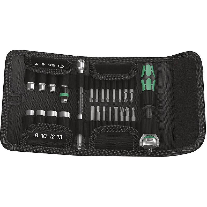 Ratschen und Schrauben im Kraftform Kompakt Format. Inklusive Zyklop-Knarre: Unglaublich hohe Schraubgeschwindigkeit. Vereinigt 5 Knarrentypen in einer Knarre. Schwungmassenkonstruktion und griffige Schnelldrehhülse für hohe Arbeitsgeschwindigkeit. Frei schwenkbarer Knarrenkopf; definierte Stellung bei 0°, 90° nach links und rechts sowie 15° von 90° nach innen; in 0°-Stellung einsetzbar wie ein konventioneller Schraubendreher. Einfache Druckknopfauslösung; Links- /Rechtsumschaltung, feinverzahnt, kleiner Rückholwinkel von 5°. Mehrkomponentiger Kraftform-Griff für ermüdungsarmes Arbeiten. 26-teilig in Falttasche zur Befestigung am Gürtel.1 Zyklop-Knarre mit 1/4"-Antrieb, 7 Zyklop-Nüsse (metrisch), 1 Zyklop-Verlängerung (lang) mit Schnelldrehhülse, 1 Verbindungsteil, 16 Bits in 50 mm Länge.