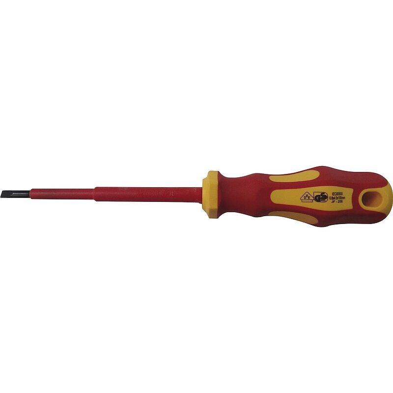 VDE isoliert bis 1000 V, mit isolierter Klinge nach DIN EN 60900 VDE 0682 Teil 201. 2- Komponentenheft mit Aufhängeloch. Klinge aus Molybdän-Vanadium Stahl mit schwarzer Spitze.