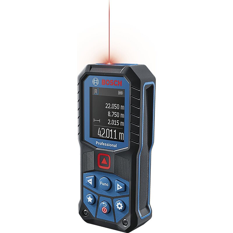 Der GLM 50-22 Professional hält rauen Bedingungen auf Baustellen stand. IP65-Design bietet vollständigen Schutz vor Staubteilchen und Strahlwasser, während sein stoßabsorbierendes Gehäuse sogar Stürzen aus 1,5 m Höhe auf harten Beton standhält. Mit einer Taste für individuelle Anpassungen können bevorzugte Messfunktionen und Einstellungen festgelegt werden. Intuitives User Interface unterstützt 30 Sprachen und bietet ein Farbdisplay; der Modus Große Zahlen sorgt für eine bessere Ablesbarkeit. Für eine selbsterklärende Anwendung verfügt er über eine neue Hilfsfunktion, die sämtliche Messoptionen anzeigt. Für Elektriker, Klimatechniker und Klempner ist er ideal für das Platzieren und Befestigen von Elementen an Holz, anderen Materialien oder Trockenbaukonstruktionen. Bei der Verwendung für den Innenausbau ist er perfekt für Maler, Bodenleger, Fliesenleger oder Zimmerer zum Berechnen des Materialbedarfs. Lange Batterielaufzeit, unabhängig davon, ob normale Alkali-Batterien oder der optionale Li-Ion-Akkupack verwendet werden.