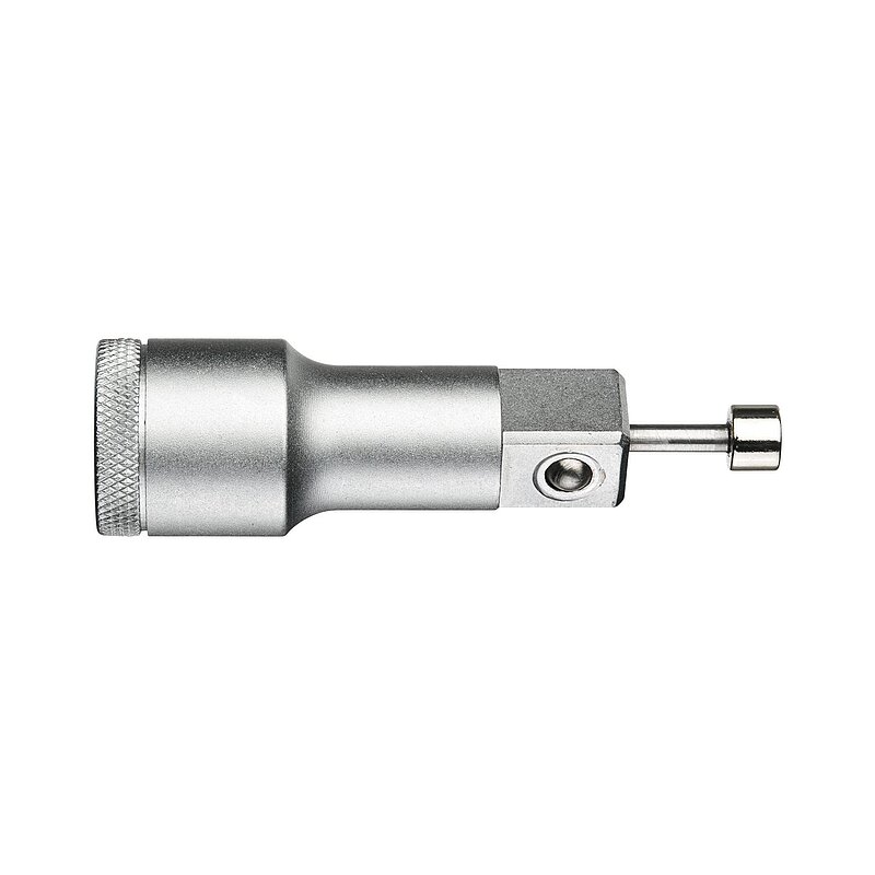 Für handbetätigte Steckschlüsseleinsätze mit Durchgangsbohrung und Vierkantantrieb nach DIN 3120, ISO 1174, mit Kugelarretierung. Der Haltemagnet fixiert die Schrauben oder Muttern im Steckschlüsseleinsatz verliersicher. Einhandbedienung - Die Schraube oder Mutter kann sofort mit dem Steckschlüsseleinsatz eingedreht werden. Der Haltemagnet hat durch eine Federmechanik immer direkten Kontakt mit dem Schraubenkopf und sorgt so für zentrische Führung der Schraube. Starker Permanentmagnet hält selbst große Schrauben fest, besonders in engen Bauräumen eine Arbeitserleichterung.